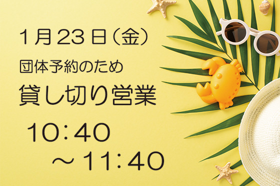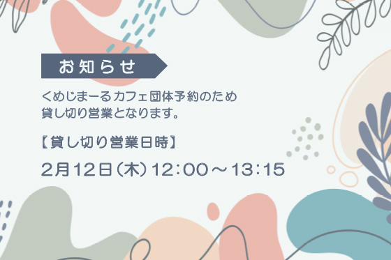 くめじまーるcaféよりご案内 いつもご愛顧賜り誠にありがとうございます。 団体予約のため貸し切り営業時間がございます。 【貸し切り営業日時】 1月23日(金)10:40~11:40 ...