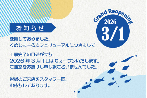 延期しておりました、 くめじまーるカフェリューアルにつきまして 工事完了の目処が立ち 2026年3月1日よりオープンいたします。 ご迷惑をお掛けし申し訳ございませんでした。 皆様のご来店をスタッフ一同、 お待ちしてお...